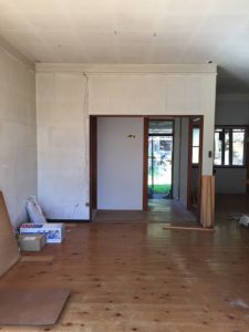 既存の壁や天井を取り除いて、いったん木の構造体だけにする