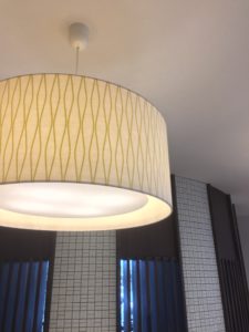 ロビーは吹抜けで、シャンデリアが飾られています。このシャンデリアはコンセプトであるジャパニーズモダンをイメージした特注品です。受付の格子は和を感じるデザインだけでなく、受付の奥にある事務所の中からロビーを覗くことができます。
