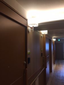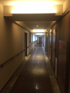 また、廊下にもきめ細かなデザインが施されています。高級感を演出する間接照明や高齢者の視力に配慮した床の色分け、腰壁から天井近くまで同じ仕上げにすることで、ホテルのような雰囲気を感じます。