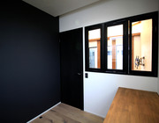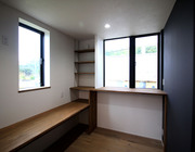 国道とJRの線路に挟まれた特殊な土地であったために、視線と音に一番配慮し、南北に二つの中庭を作りました。一つは玄関と小上がりから、もう一つはキッチンとリビングから見えるようになっています。LDKは空間を広く持たせるために吹き抜けにし、天井が高くなっており、北側からの採光にも配慮しています。ご夫婦の提案で、床暖房ではなく、エアコンの輻射熱を利用したパネルで温熱環境を整えました。また、壁に挟まれがちな階段も吹き抜けにして広さと高さを出し、アイアンの手すりをつけています。ご夫婦とも建築関係のお仕事で、ご主人様は基礎工事や左官業を営まれ、お部屋の壁、外構などはもちろんご自身の作品となっており、エクステリアや造園などのお仕事をしてみえる奥様は、素材や配置など当社と一緒になって細かく考えさせていただきました。そんなお仕事柄、来客も多く、玄関は中でプライベートスペースとゲストスペースに分かれており、各自の書斎スペースもしっかり確保されており、そこには瞑想や読書など一人になってゆったり考え事ができるような工夫も入っています。外構や植栽などご自身での作業が全部完成するのは来年とのことで、また追加していきたいと思います。