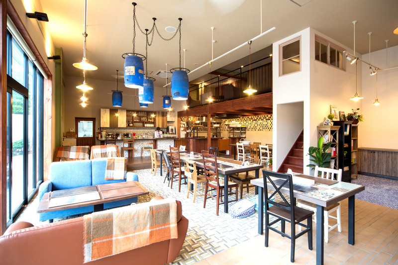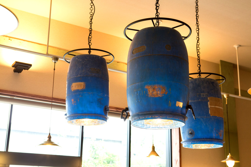 天井高さを生かした空間には、釉薬を入れるための青い樹脂容器をそのままシャンデリアカバーとして転用し、カフェのシンボルとしています。