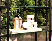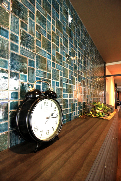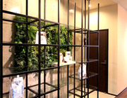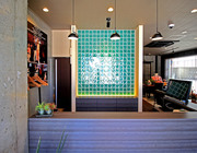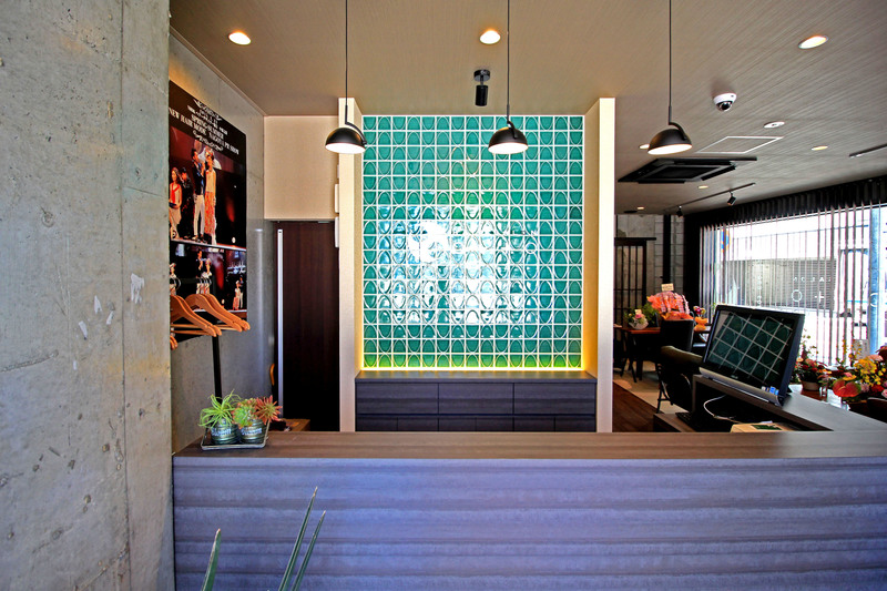 各所に貼られた個性的なタイル、和風テイストを印象付ける格子戸、坪庭をイメージした壁面グリーン、若手女性作家による陶器の花をイメージしたモビールなど、さまざまな仕掛けがお客様を楽しく、心地よい気分となるような空間が完成しました。