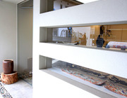 伝統的と敢えて相反するデザインを意図したモダンなショールームには、魅力的な陶器をちりばめ、秀峰様の作品をより魅力的に魅せるための空間を創っています。