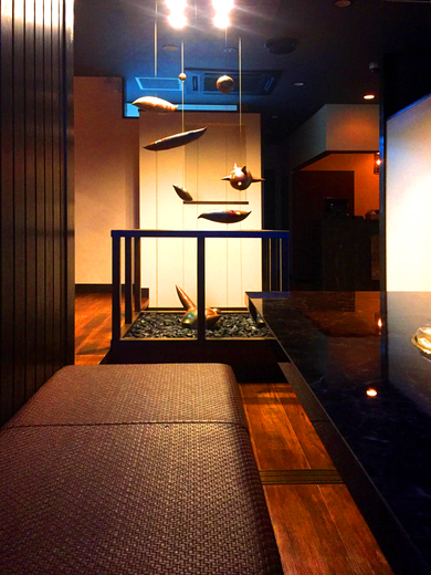 個室の入り口には欄間、天井からはシャンデリアなど和洋折衷の異空間をつくりました。