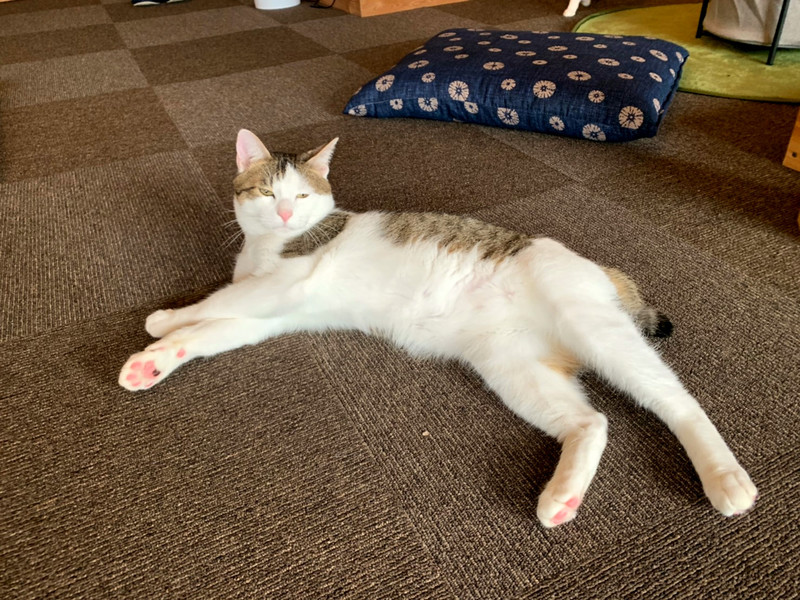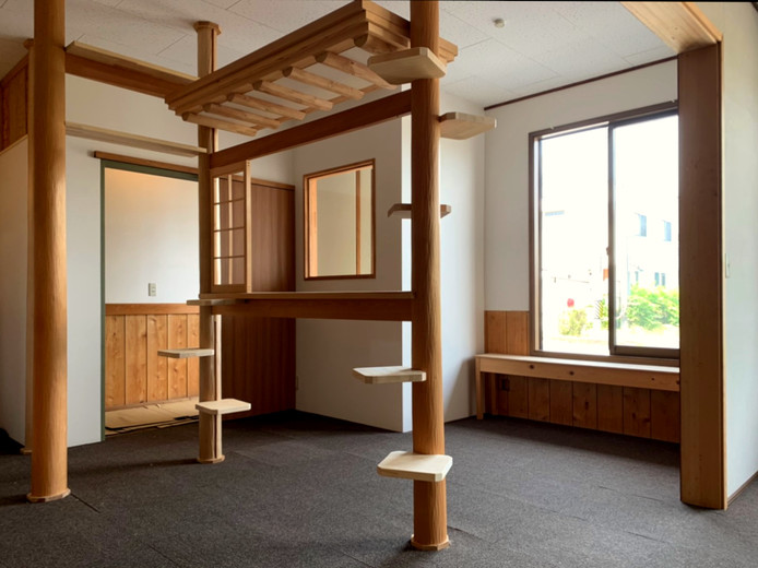 屋台はもとからここにあったものを利用し、柱に板を付けてオリジナルキャットタワーを造作しています。