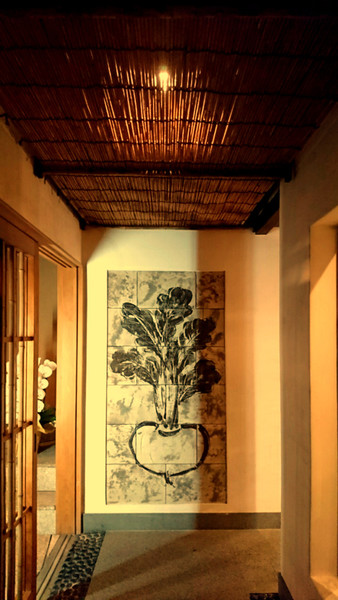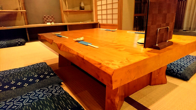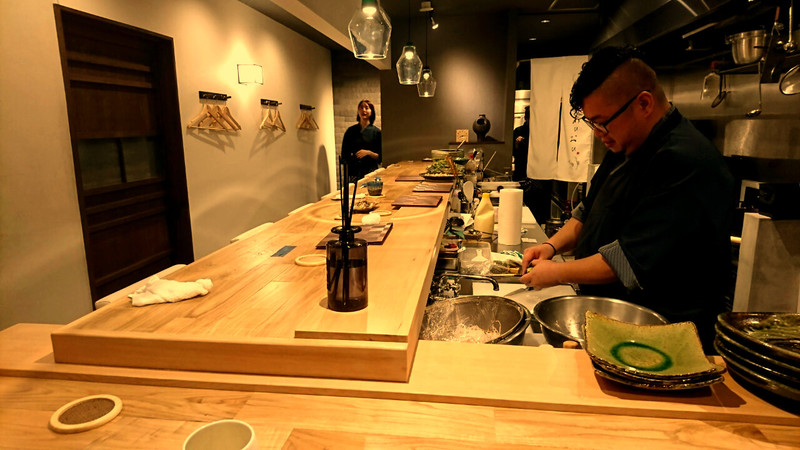 玄関の格子戸を抜けると、右手にお座敷スペース、奥へつながる石張りの通路を進むと漆喰の蔵をイメージしたスペースにカウンターと厨房があります。
