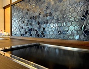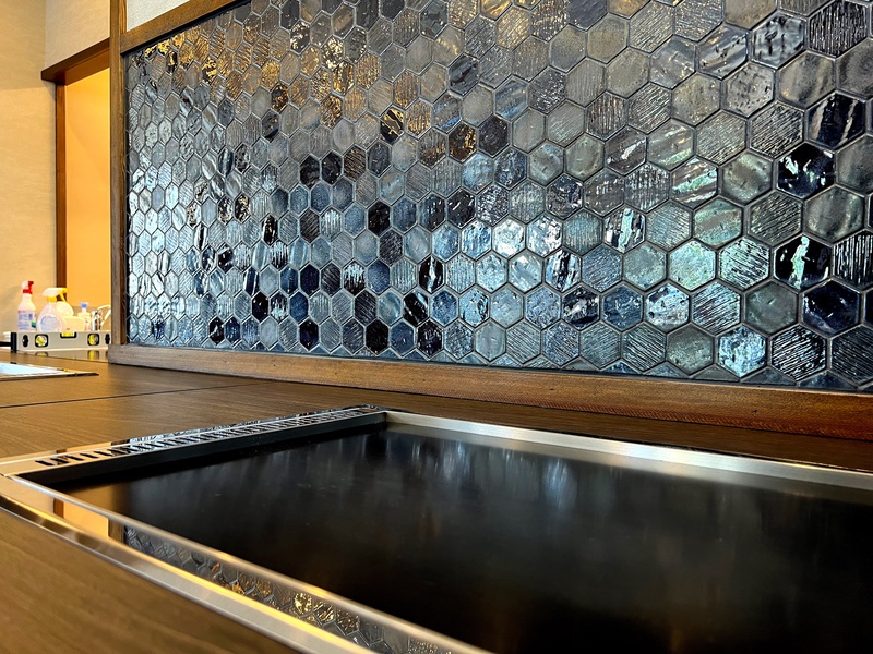カウンター席の一部壁にアクセントタイルを張り、掃除のしやすさにも考慮したデザインとなっています。